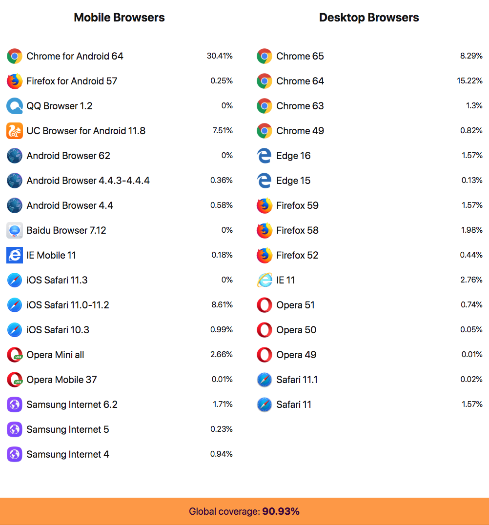 since 2015orlast 2 years:自某个时间以来更新的版本(也可以写的更具体since 2015-03或者since 2015-03-10)根据时间点去判断是否适用;> 5%: 基于全球使用率统计而选择的浏览器版本范围。>=,<,<=同样适用。